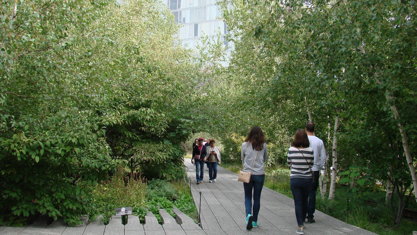 It stands around 30 feet above street level, is green, has trees and plants growing on it, with people walking and jogging along.